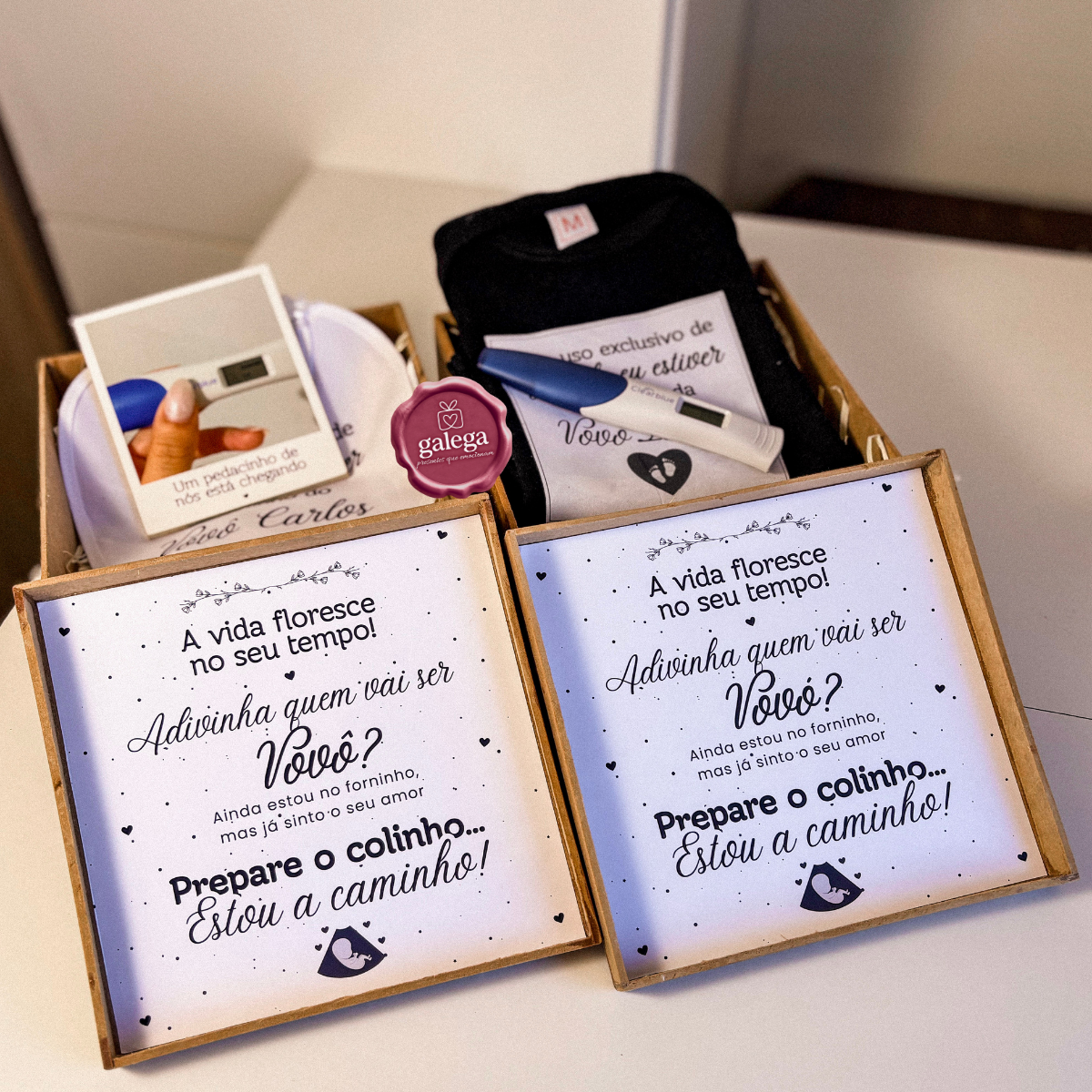 Essa caixa foi pensada pra transformar o momento de contar uma gravidez em uma lembrança que vai ficar pra sempre.