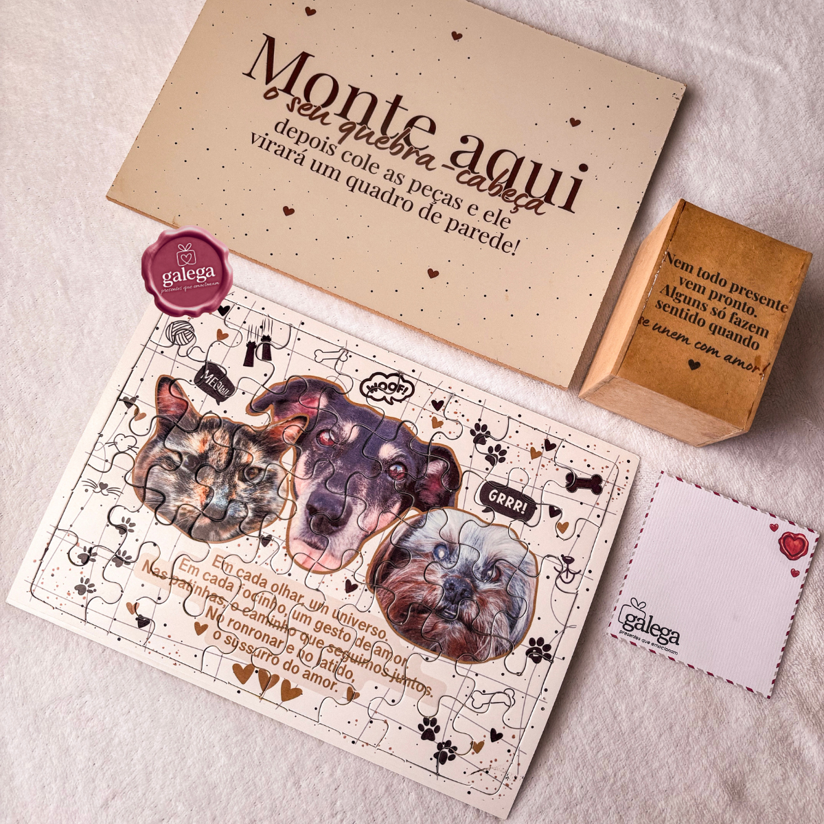 Acompanha também uma caixa personalizada com frase, onde vão as peças. O quebra-cabeça é enviado desmontado, justamente para que a surpresa aconteça durante a montagem.